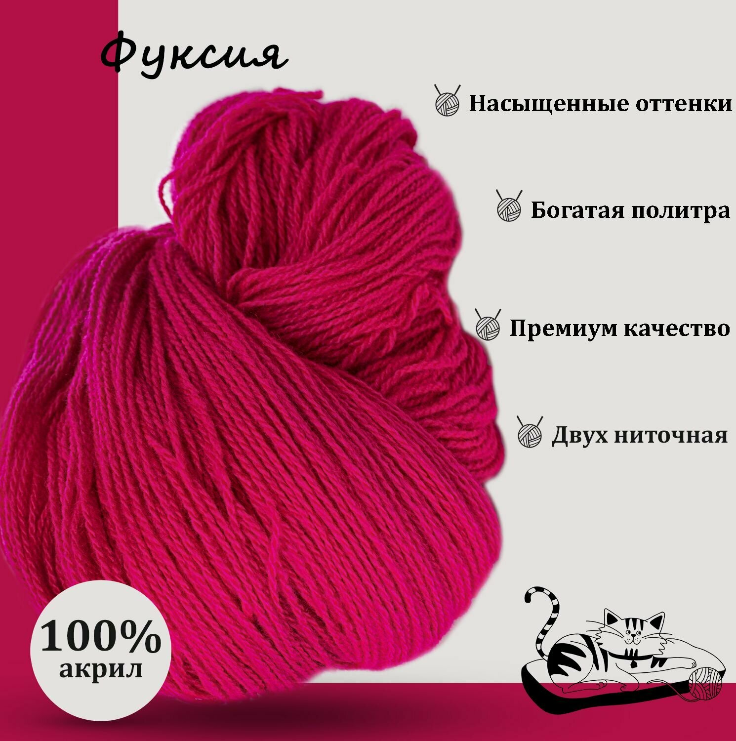 Карачаевская пряжа мягкая в пасмах нитки 100 % акрил для вязания 600-650м/250-280гр, Фуксия информация: