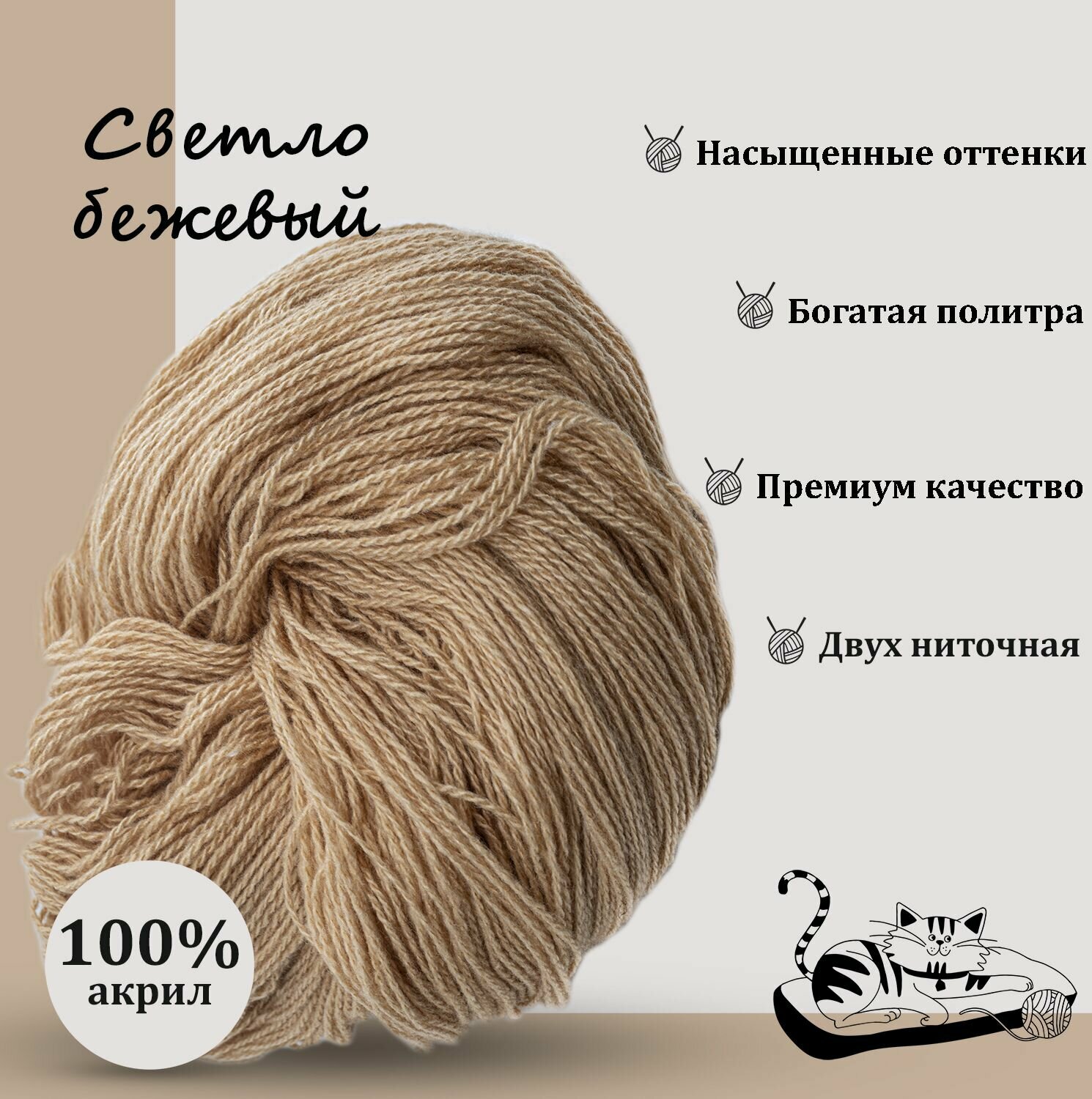 Карачаевская пряжа мягкая в пасмах нитки 100 % акрил для вязания 600-650м/250-280гр, Светло-Бежевый информация: