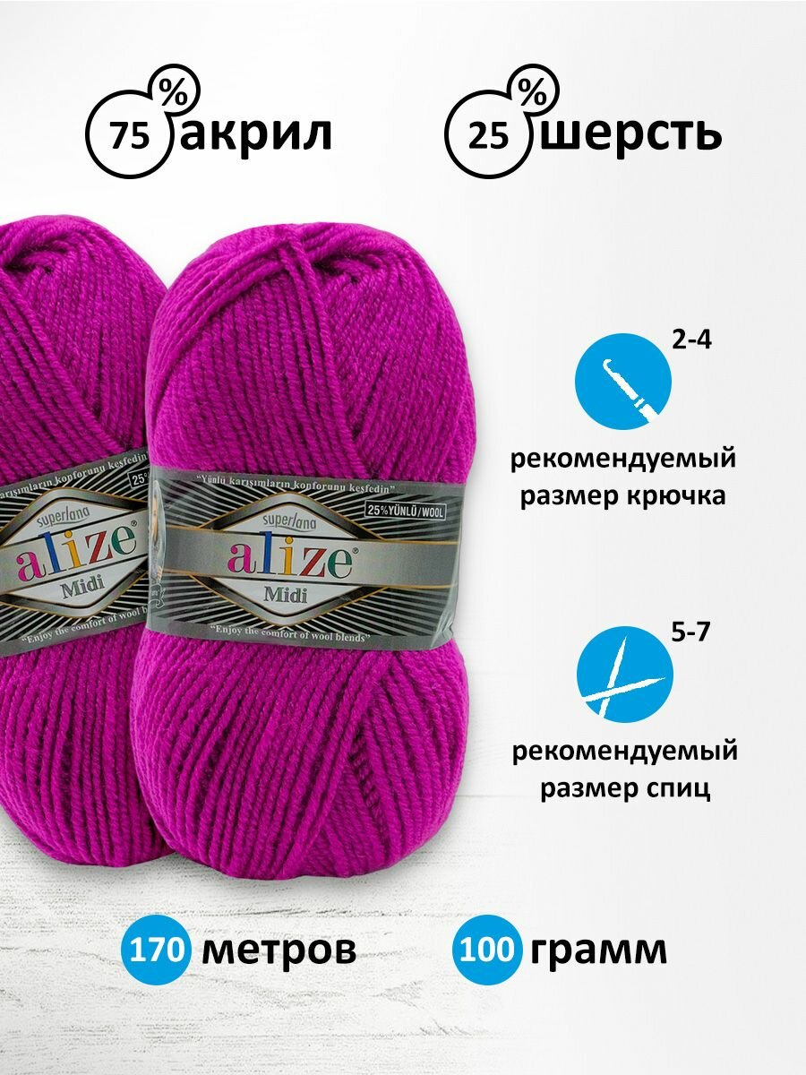 Пряжа Alize Superlana Midi темная фуксия (798), 25%шерсть/75%акрил, 170м, 100г, 1шт