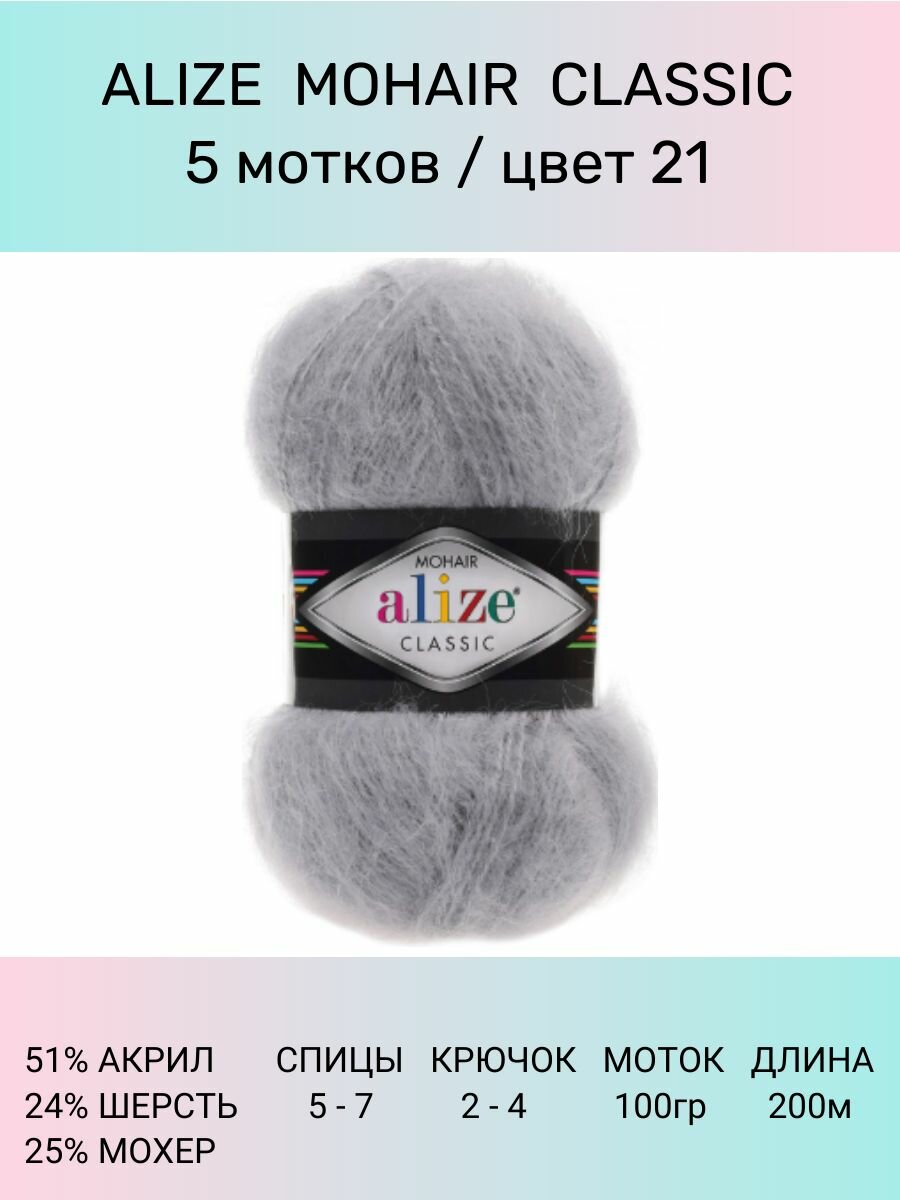 Пряжа для вязания ALIZE 'Mohair classic new', 100г, 200м (25% мохер, 24% шерсть, 51% акрил) (21 серый), 5 мотков информация: