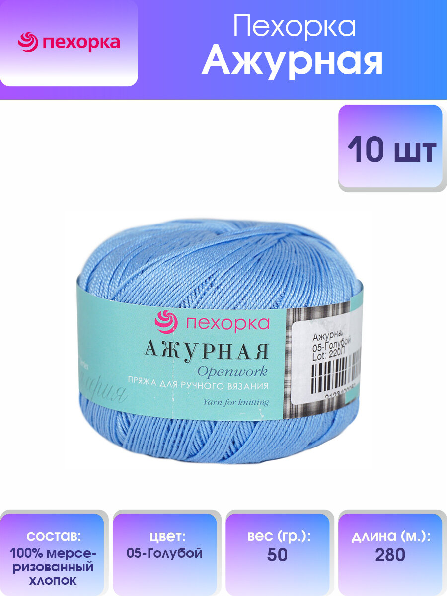 Пряжа Пехорка Pehorka Ажурная средняя, хлопок мерсеризованный 100%, цвет 005, голубой, 10 шт. по 50 г, 280 м