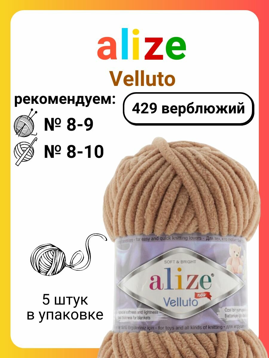 Пряжа VELLUTO (Alize), верблюжий - 429, 100% микрополиэстер, 5 мотков, 100 г., 68 м. 1 550 ₽
