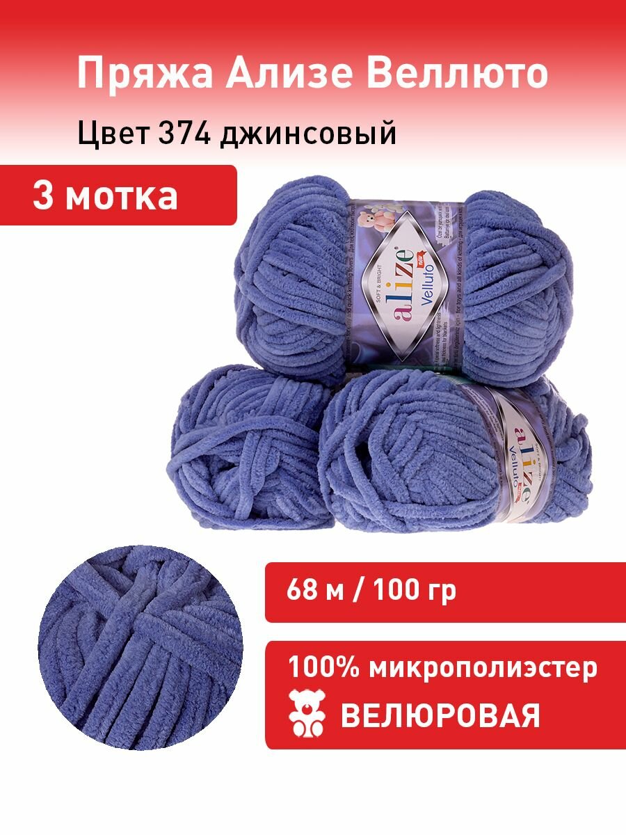 Пряжа Alize Velluto джинсовый (374), 100%микрополиэстер, 68м, 100г, 3шт информация: