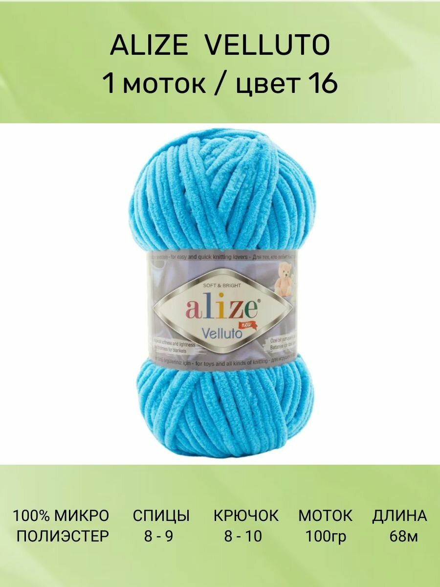 Пряжа Alize Velluto бирюзовый (16), 100%микрополиэстер, 68м, 100г, 1шт информация: