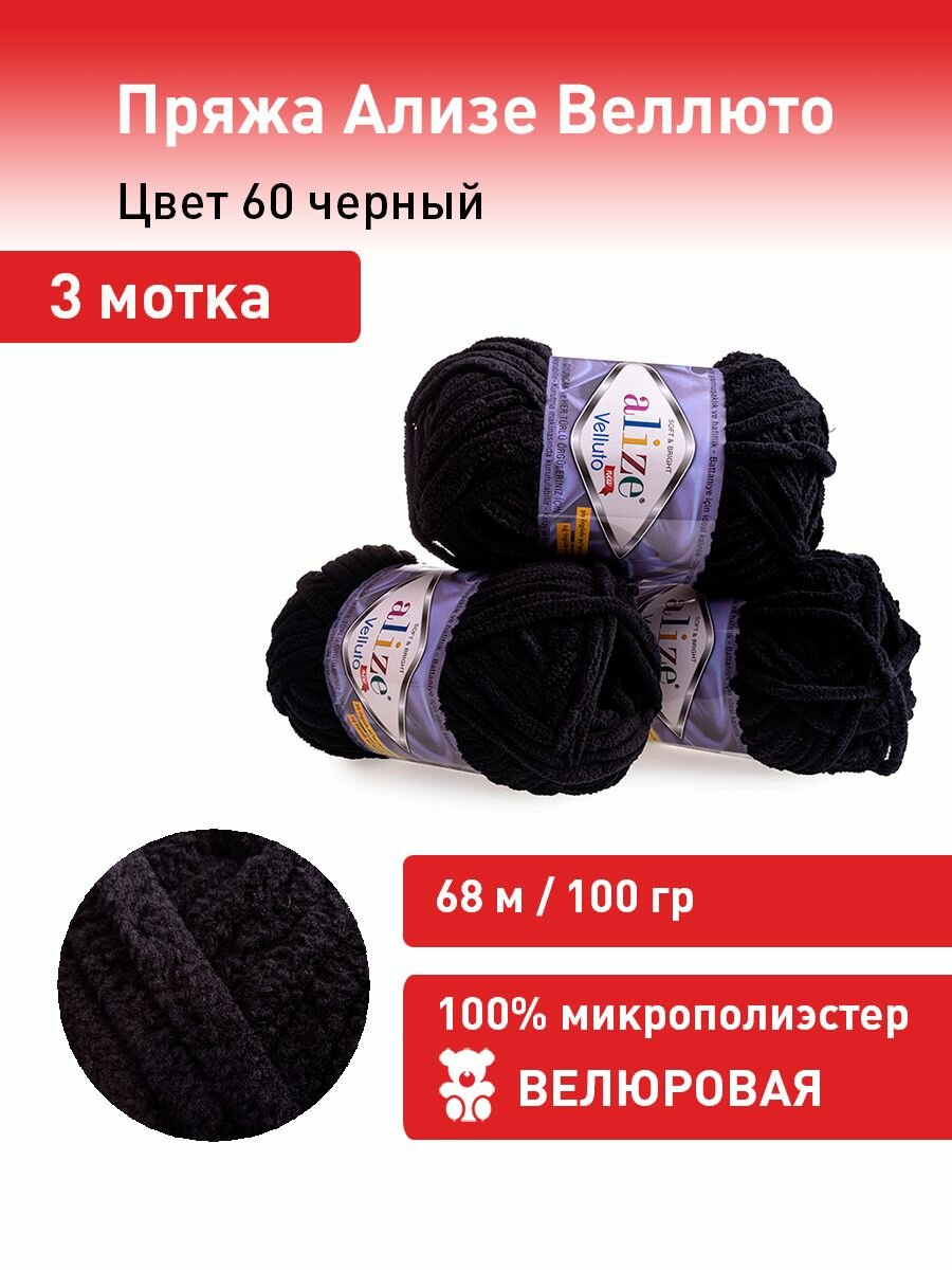 10 цен на Пряжа Alize Velluto (Ализе Веллюто) - 3 мотка 60 черный 100% микрополиэстер 68м/100г