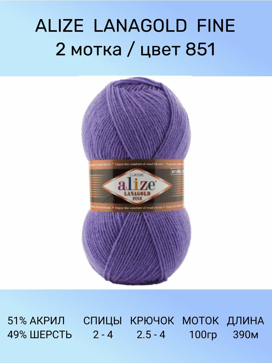 Пряжа Alize Lanagold Fine сиреневый (851), 51%акрил/49%шерсть, 390м, 100г, 2шт информация: