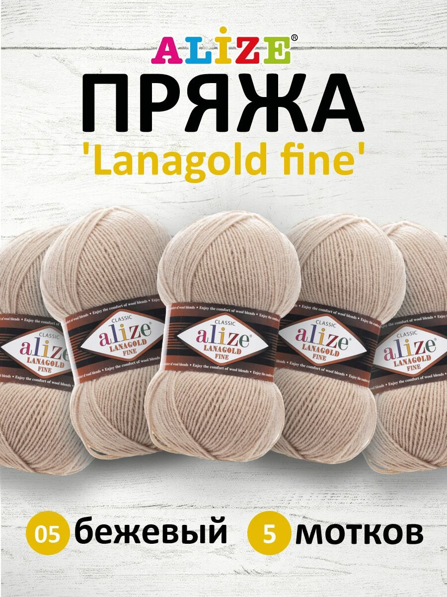 10 цен на Пряжа Alize Lanagold Fine (Ализе Ланаголд Файн) - 5 мотков, 05 бежевый, 49% шерсть, 51% акрил 390м/100г