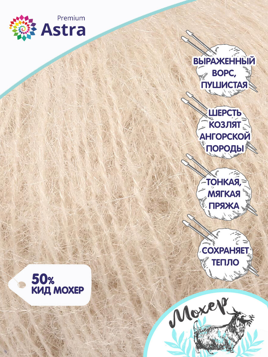 Пряжа для вязания Astra Premium 'Мохер' (Mohair) 25гр 190м (+/-5%) (50% кид мохер, 50% акрил) (17 светлый беж), 4 мотка информация:
