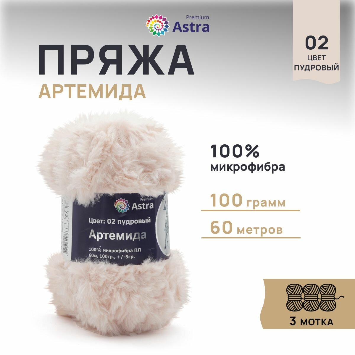 Пряжа Astra Premium "Артемида", 100 гр 60 м, 100% микрофибра ПЛ, 02 пудровый, 3 шт информация: