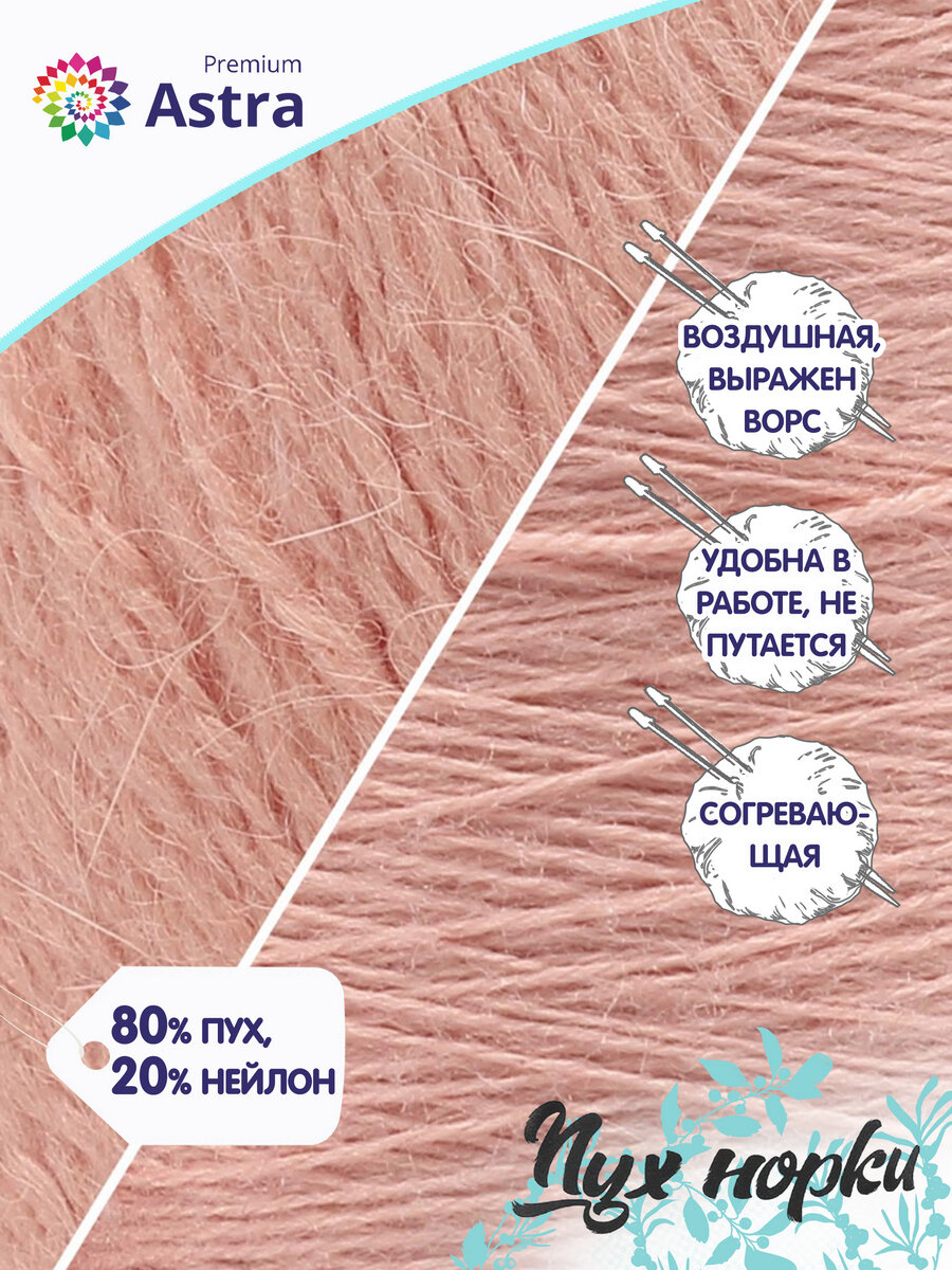 10 цен на Пряжа для вязания Astra Premium 'Пух норки' (Mink yarn), 50г, 290м (+- 5%) (80% пух, 20% нейлон) (+ нить 20 г) (031 персиковый)