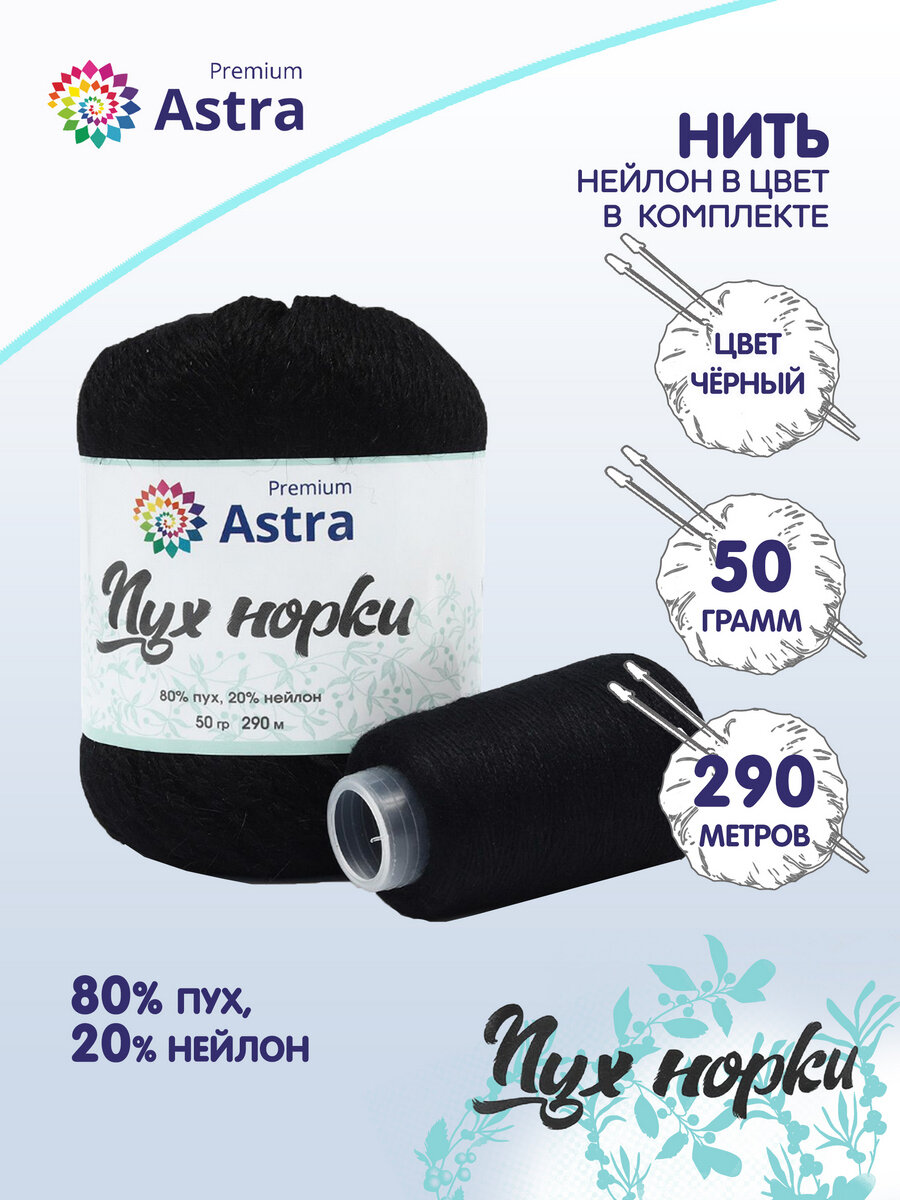 Пряжа Astra Premium "Пух норки", 50 гр 290 м, 80% пух, 20% нейлон, нить 20 гр, 011 черный 622 ₽
