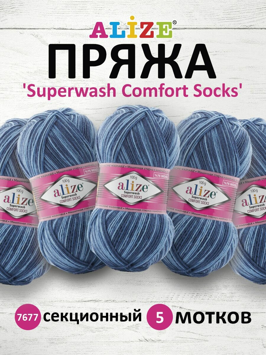 Пряжа Alize Superwash comfort socks голубой-серый-синий (7677), 75%шерсть/25%полиамид, 420м, 100г, 5шт 1 551 ₽