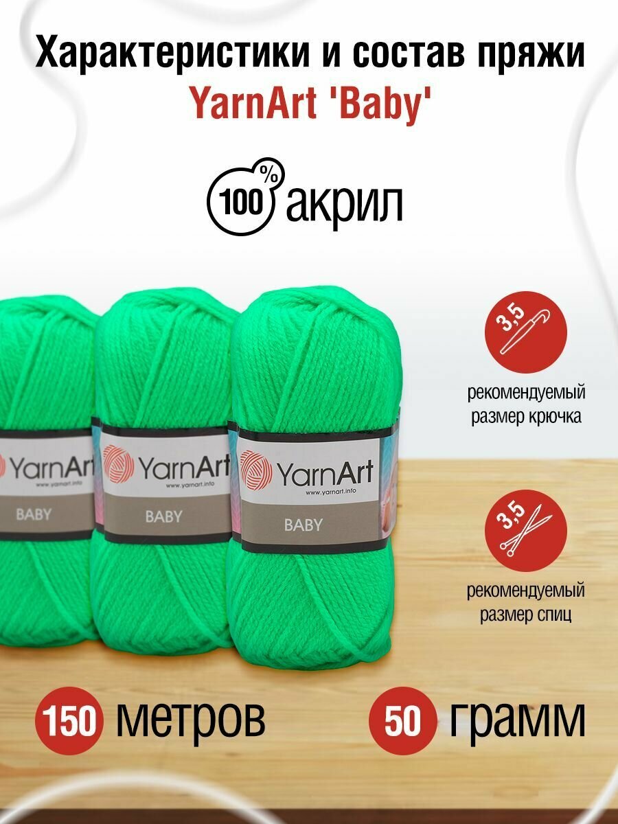Пряжа для вязания YarnArt Baby (ЯрнАрт Беби) - 1 моток 8233 ярко-зелень, гипоаллергенная для детских изделий, 100% акрил, 150м/50г