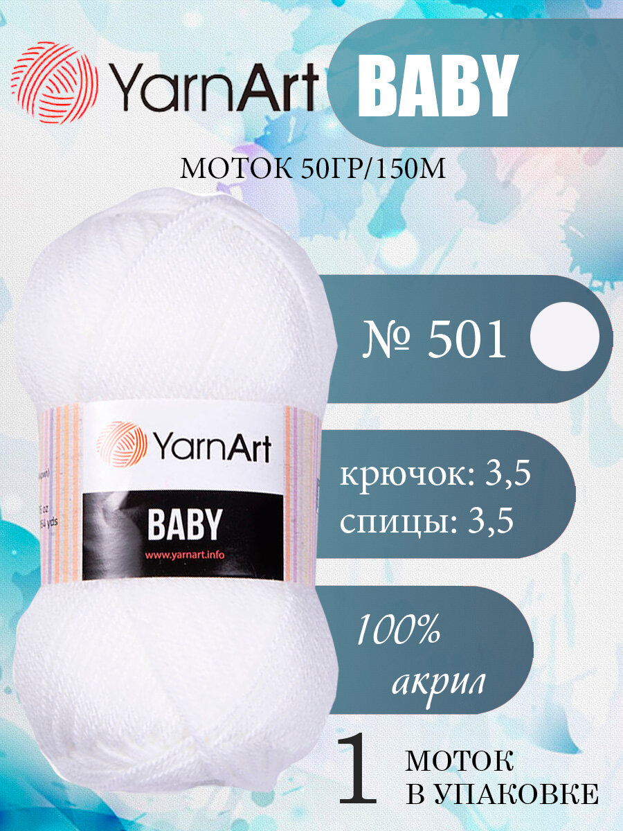 Пряжа для вязания спицами, крючком YarnArt, Baby, 100% акрил, 150 м/50 г, (501 белый) 386 ₽