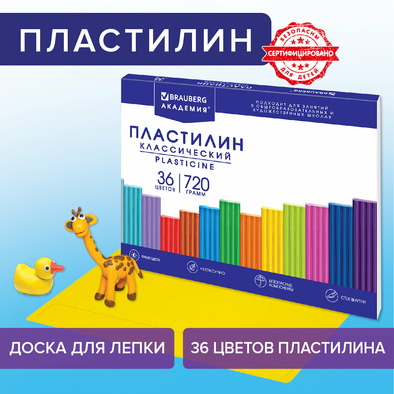 Пластилин классический для лепки (набор) для детей 36 цветов со стеком + Подарок Доска для лепки А4, 720г, Brauberg, 880566 информация: