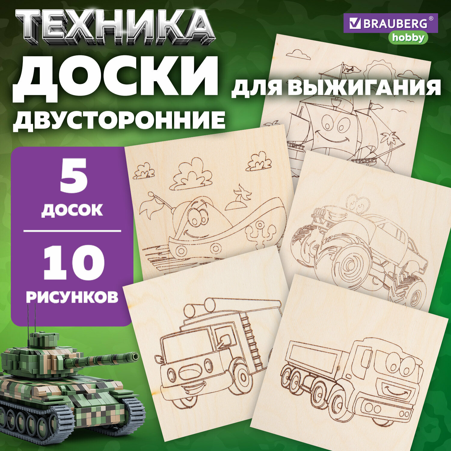Набор для выжигания по дереву, деревянные заготовки для творчества Транспорт, 5 штук 10 рисунков, 15x15 см, Brauberg Hobby, 665305 информация: