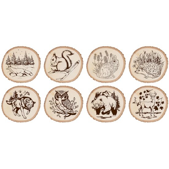| Подробная комплектация | спил березы 1 шт - диаметр 15,5 см, толщина 1,8 см; чёрная копировальная бумага А4; рисунки на бумаге 8 штук - 16х16 см |
