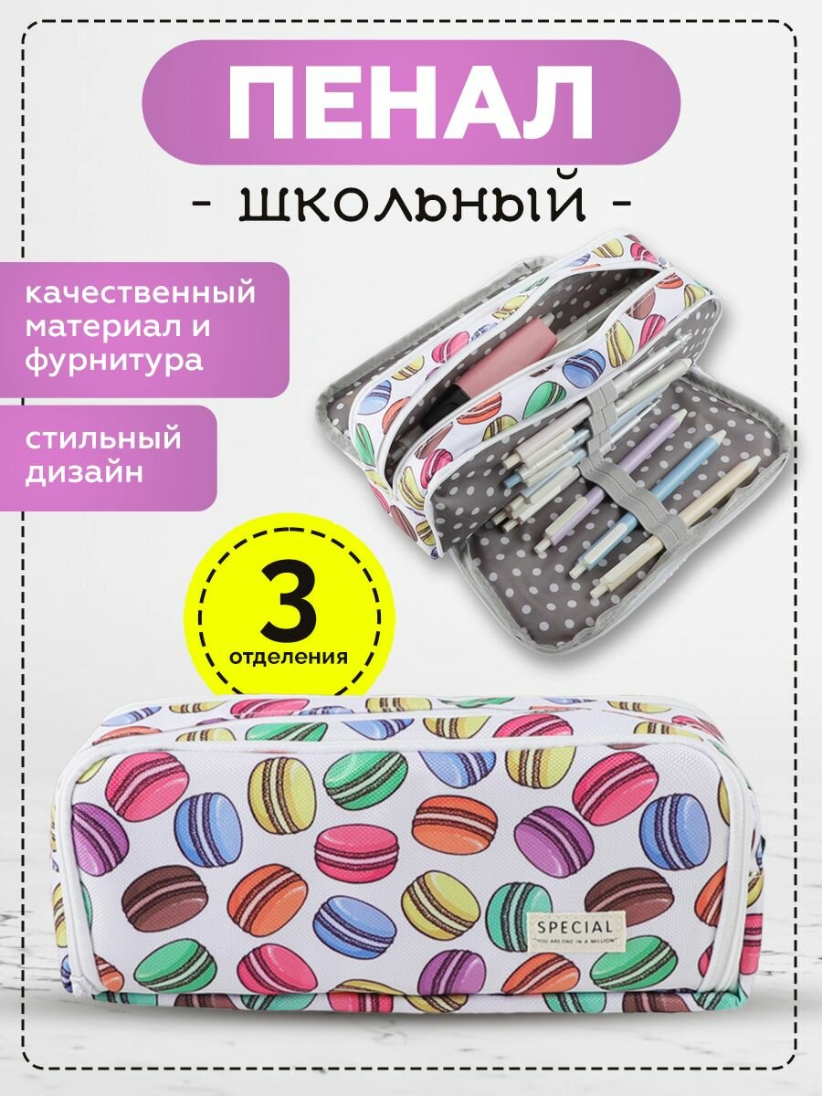 Пенал для девочек и мальчиков 3 отдела на молнии для школы, макаруны информация: