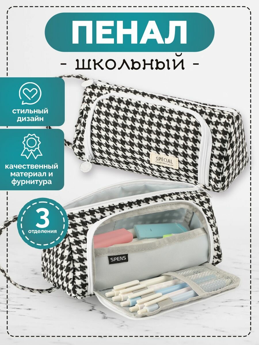 Отзывы на Пенал для девочек и мальчиков 3 отдела на молнии для школы, черно-белые ромбы