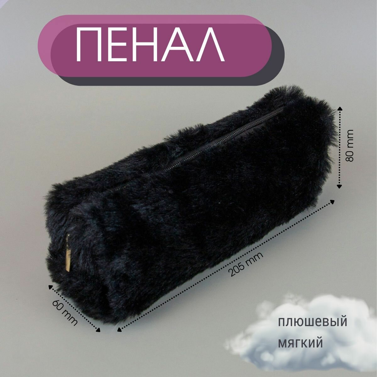 Пенал плюшевый мех, пенал-косметичка однотонный - Черный информация: