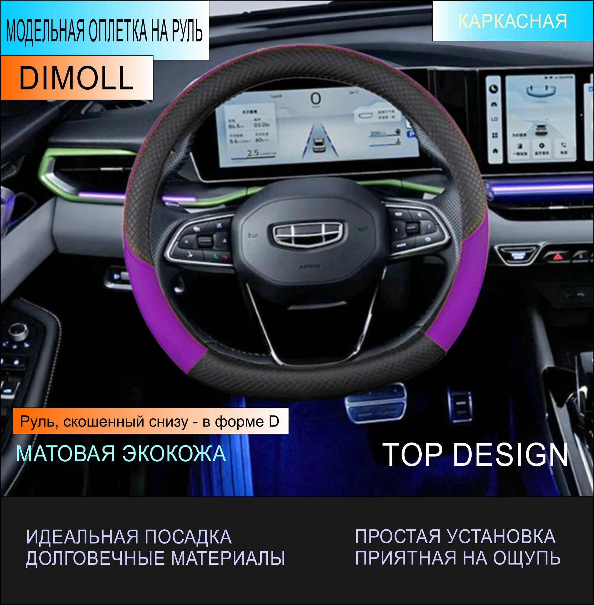 Оплетка (чехол) на D образный руль, скошенный снизу каркасная Geely Atlas 2016 - н.в. экокожа, черная, фиолетовая информация: