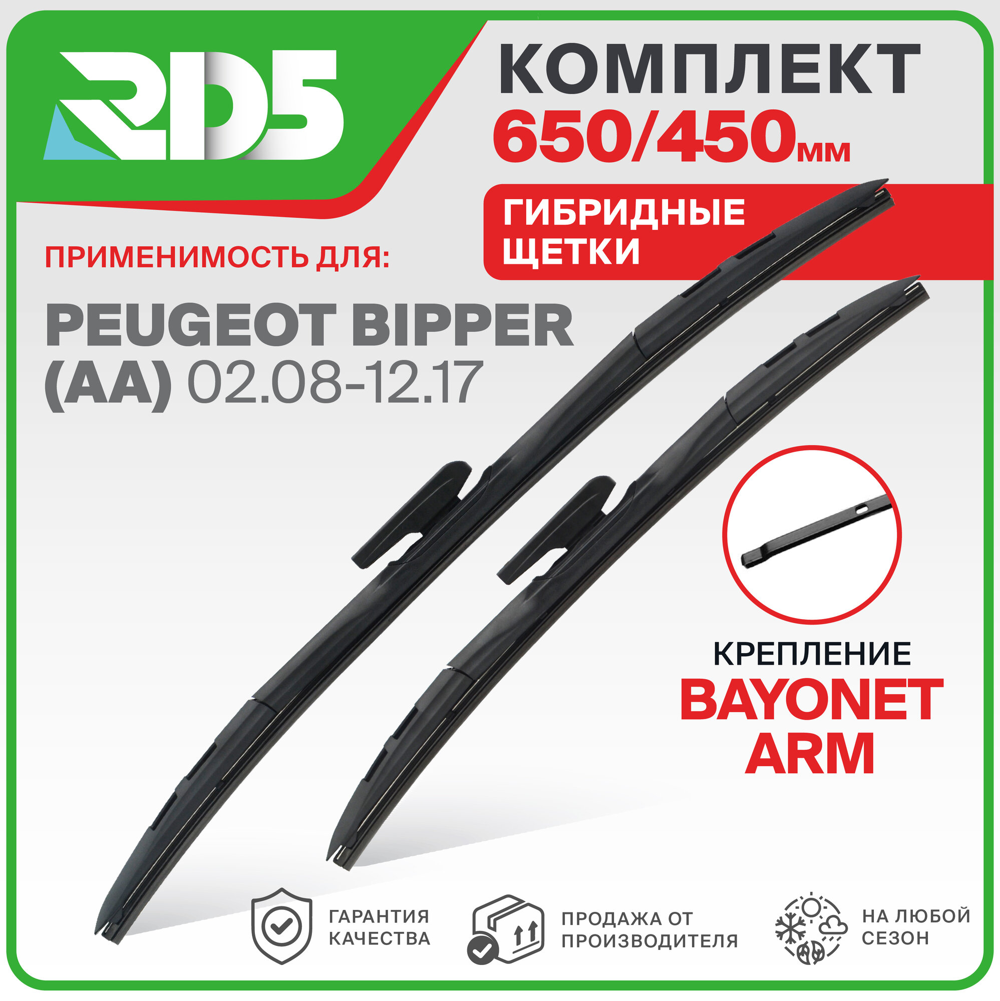 650 450 мм. Крепление Bayonetarm. Комплект гибридных щеток стеклоочистителя RD5 дворники на Peugeot Bipper; Пежо Биппер информация: