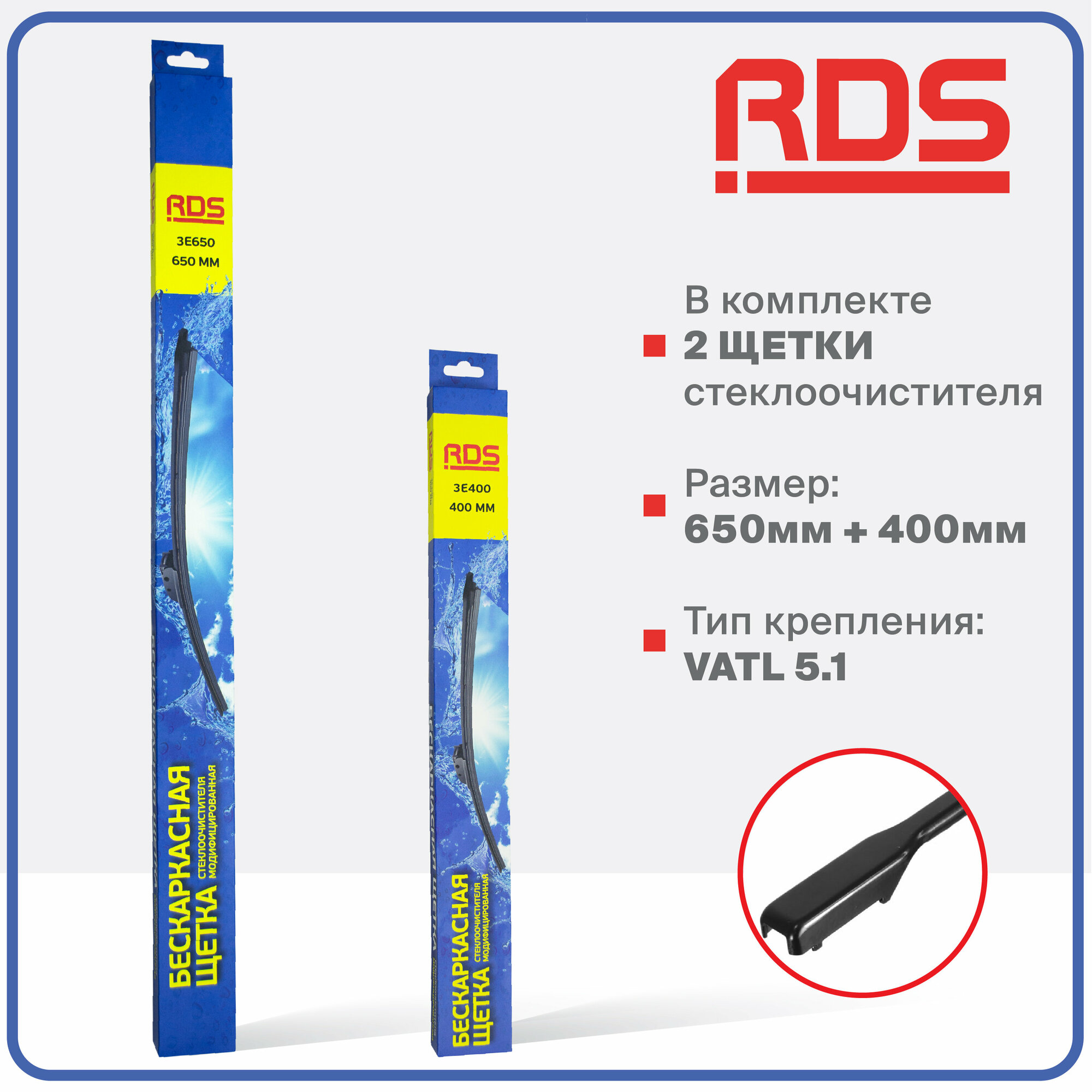 | Подробная комплектация | Комплект автомобильных дворников - 2 щетки стеклоочистителей с креплением Vatl5.1 |
