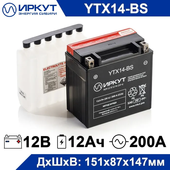 Мото аккумулятор иркут YTX14-BS 12 В, 12 Ач, 200 А, для электромобиля, аварийного освещения, кассового терминала, весов, GPS оборудования, фонаря информация: