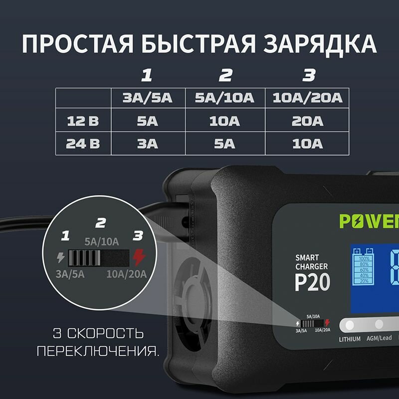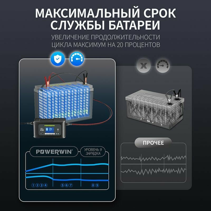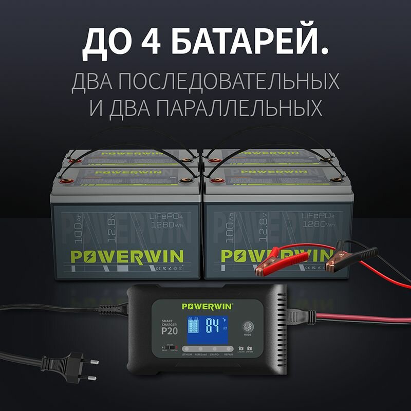 POWERWIN BT100 LiFePo4 Аккумулятор 12 В 100 Ач/1280 Втч P20 20A, 12V20A, 24V10A Умное зарядное устройство информация:
