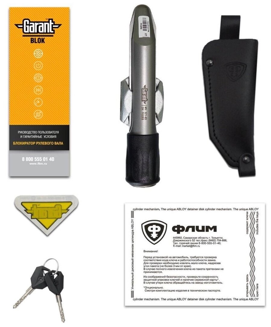 | Подробная комплектация | Стопор - 1 шт. Муфта - 1 шт. Ключ - 2 шт. Кожаный футляр для хранения стопора - 1 шт. Сервисная карта клиента - 1 шт. Руководство пользователя и гарантийные условия - 1 шт. Наклейка на лобовое стекло автомобиля с логотипом GARANT - 1 шт. |