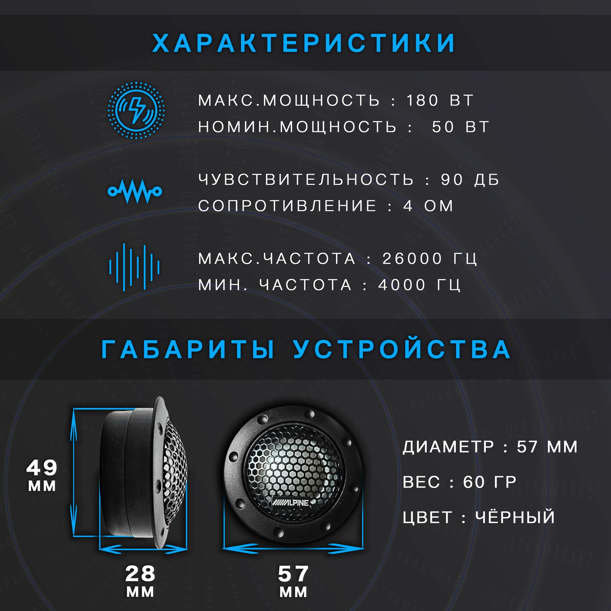 Автомобильная акустическая система / Высокочастотные динамики / Твитеры ALPINE (180 Вт) 2 шт. информация: