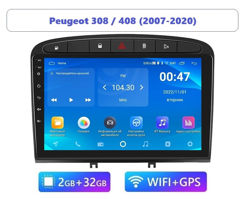 Автомагнитола Peugeot 308/408 2007-2020 2GB/32GB (Android / Wi-Fi / GPS / Bluetooth) / с экраном / Bluetooth / блютуз / андроид / подключение камеры информация: