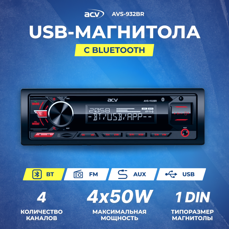 Ресивер-USB ACV AVS-932BR (1din/красная/BT/2USB/AUX/SD/FM/2RCA/QC/4*50) информация: