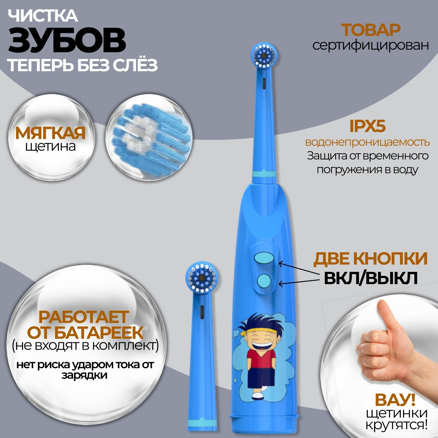 Электрическая зубная щетка детская Biksi, с 2 насадками, от 2 батареек АА, синий информация: