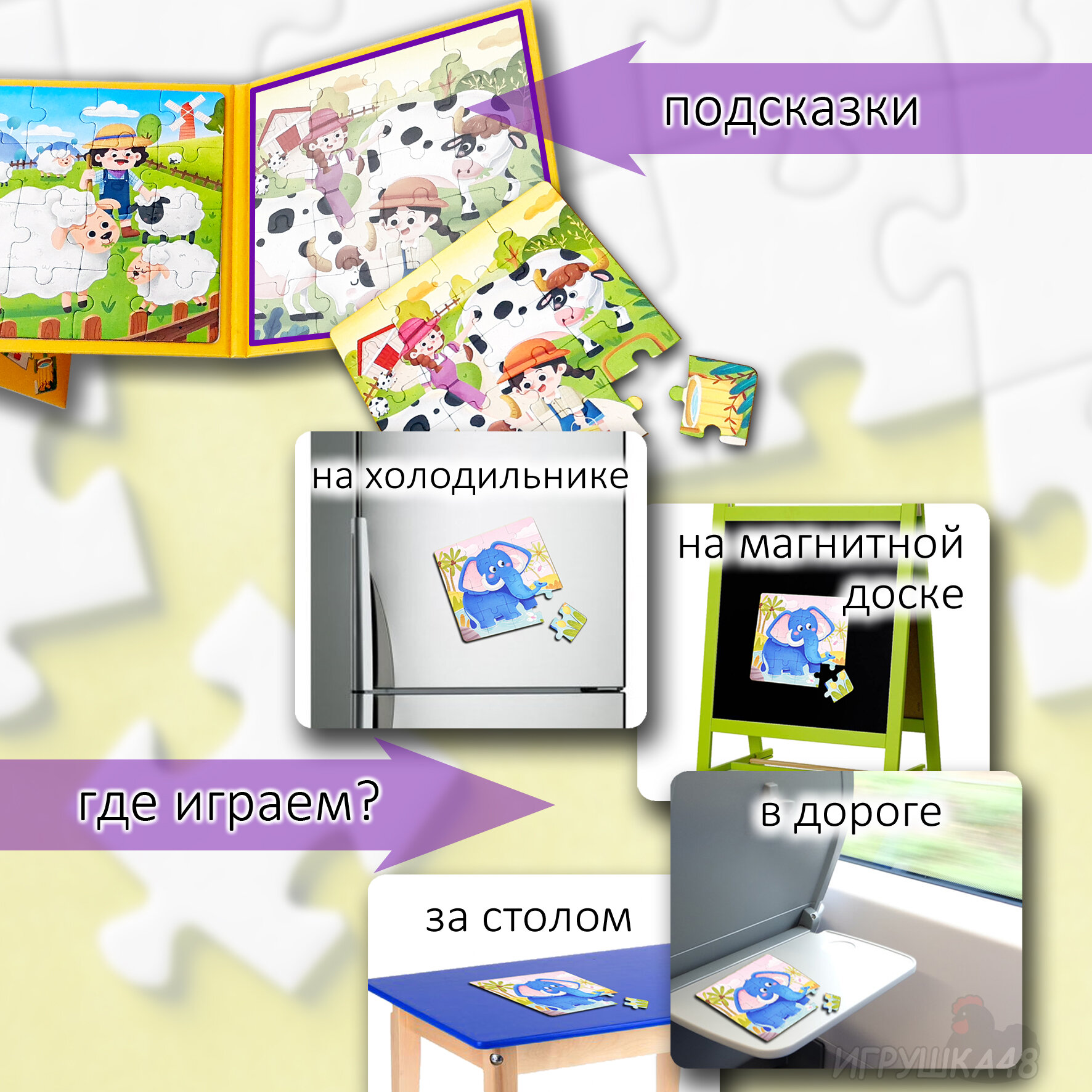 10 цен на Магнитный пазл для малышей 3 в 1 / Пазл на магнитах игра в дорогу / Набор пазлов разного уровня сложности, 18*18*1,5см, 48 деталей, Ферма, жёлтый