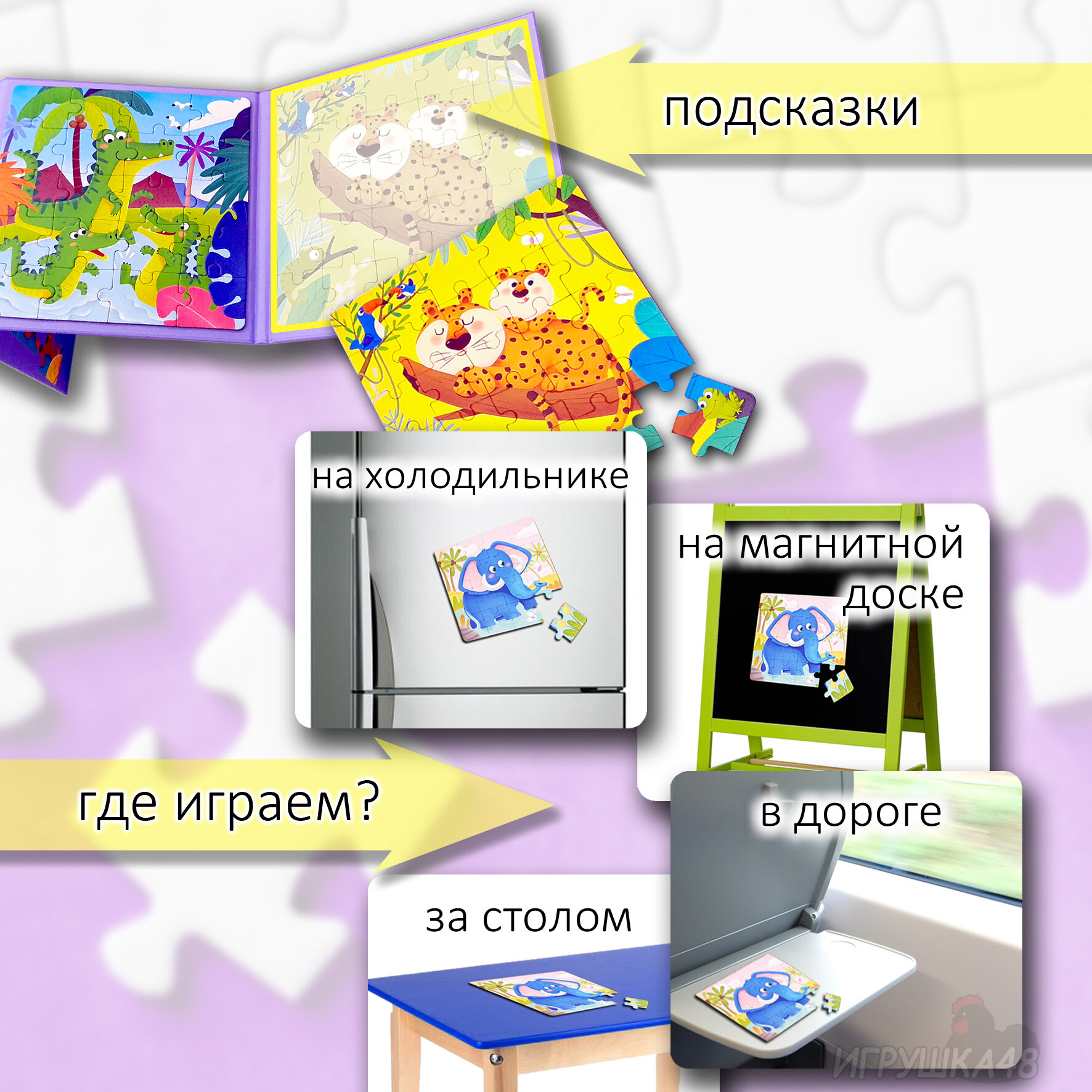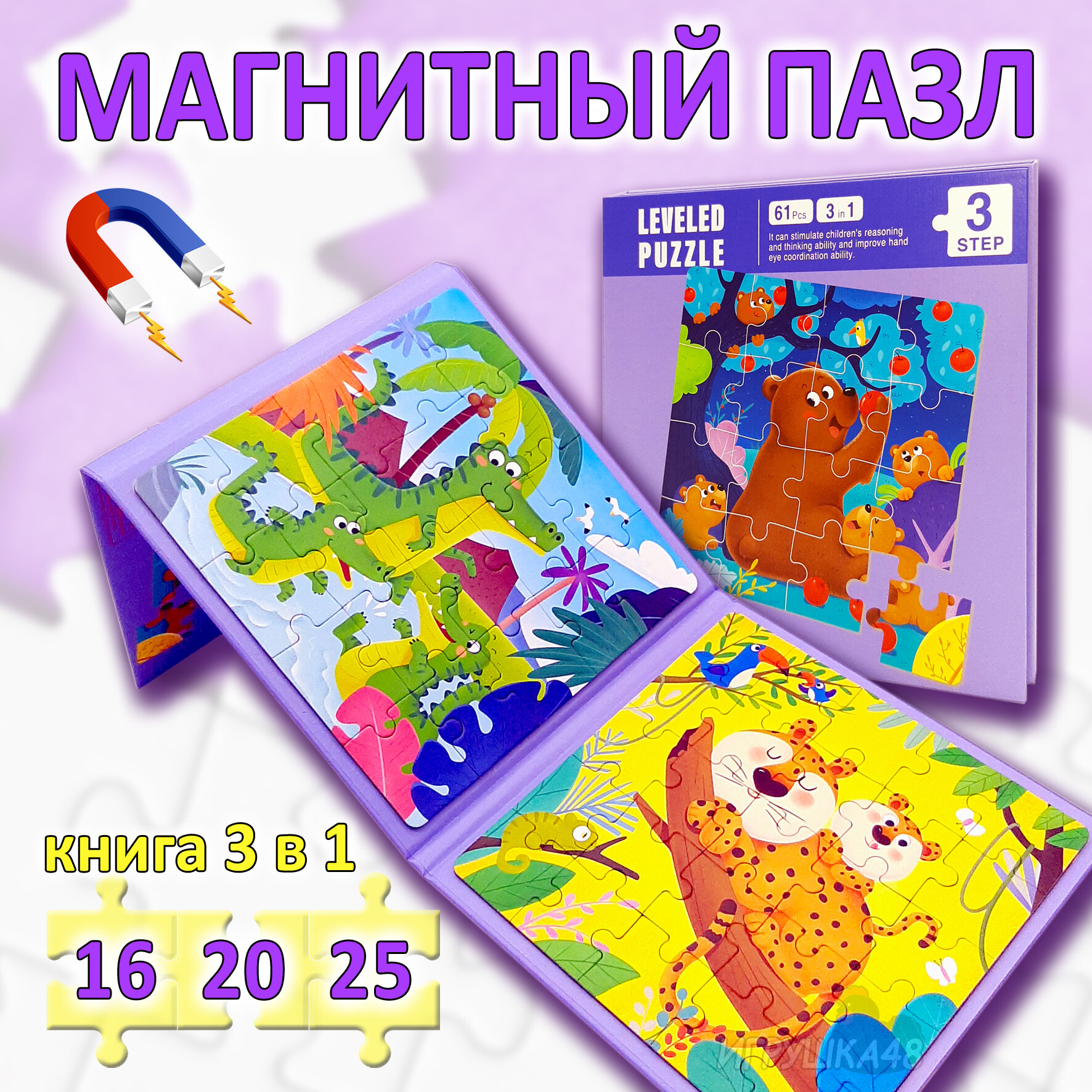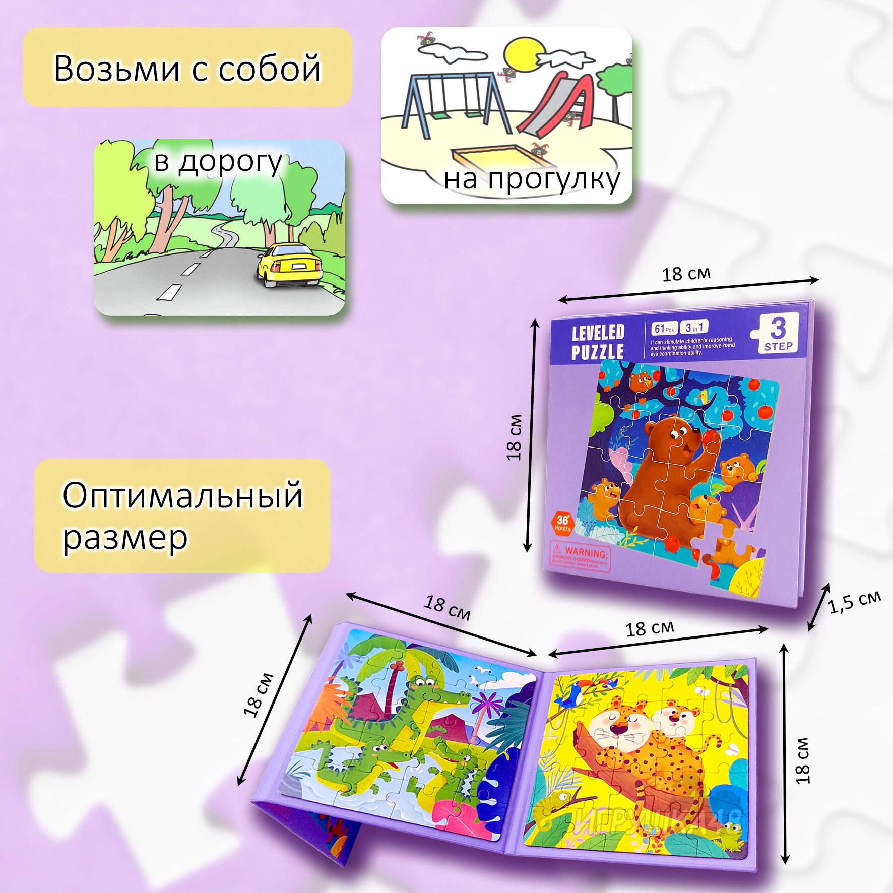 Магнитный пазл для малышей 3 в 1 / Пазл на магнитах игра в дорогу / Набор пазлов разного уровня сложности, 61 деталь, Лесные животные, фиолетовый информация: