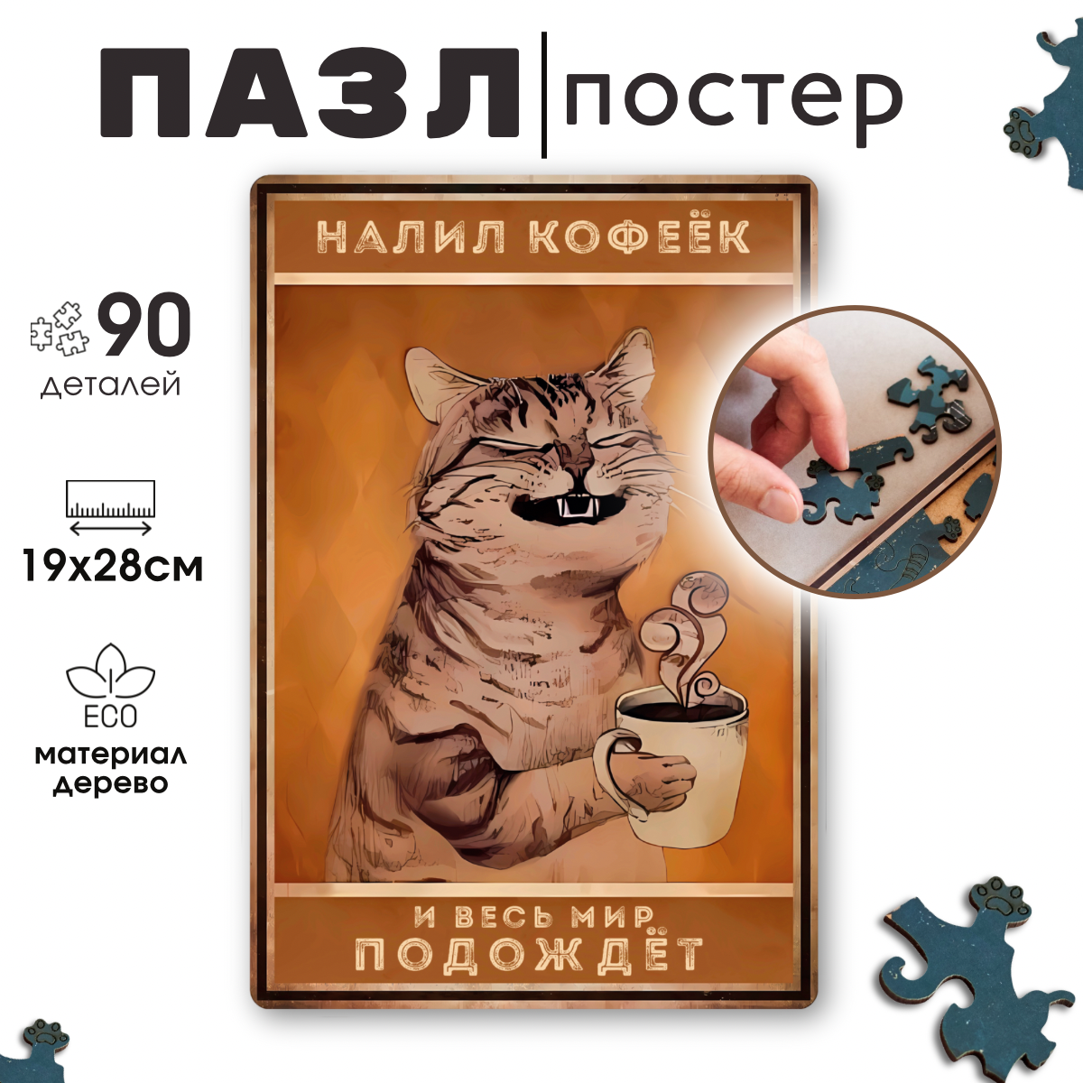 Деревянные пазлы для взрослых и детей с рамкой 90 уникальных фигурных деталей кот кружка кофе Vintage Puzzle Posters 976 ₽