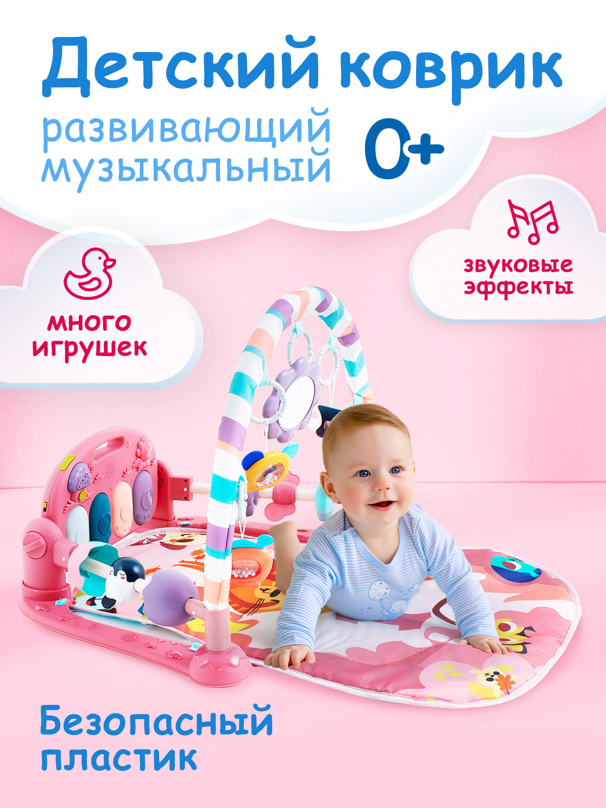 Музыкальный коврик ZABIAKA развивающий со звуком, розовый