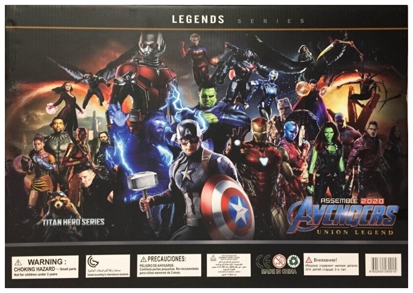 | Комплектация | Персонажи: Танос Халк Тор Грут Ракета Человек Паук Железный Человек Капитан Америка Черная Пантера Капитан Марвел |