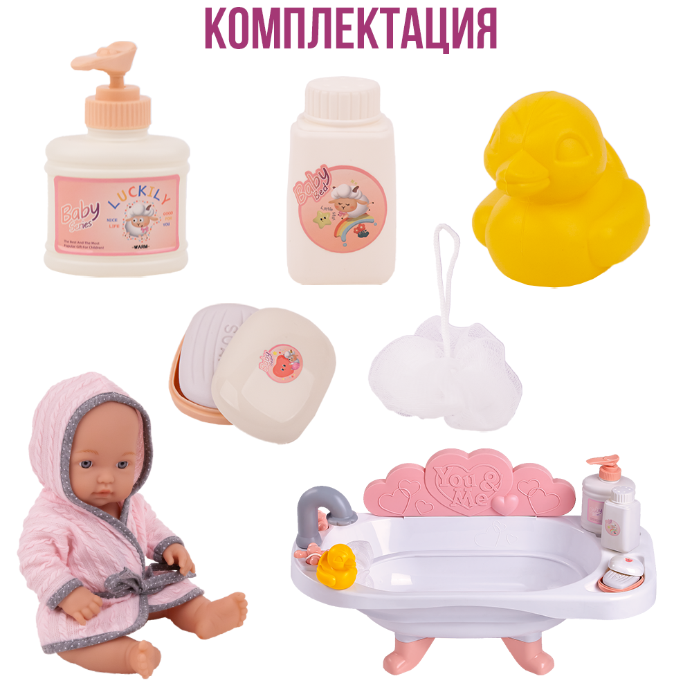 | Комплектация | кукла-пупс, ванночка для купания, халатик для куклы, мочалка, уточка, мыло с мыльницей, шампунь и присыпка |