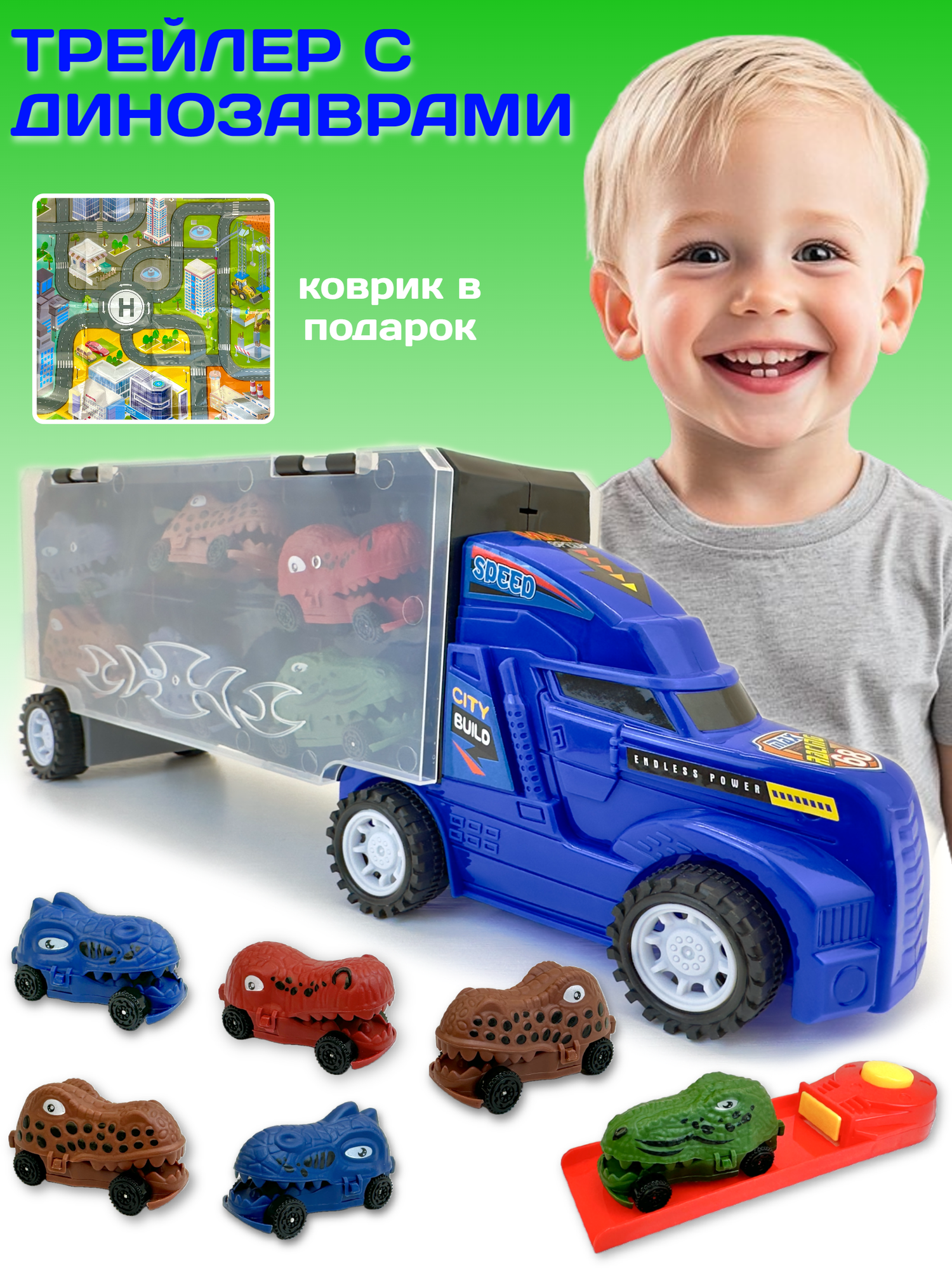 Отзывы на Трейлер-гараж с набором машинок, машина-автовоз (кейс с ручкой), катапульта, коврик, 39х14х7 см