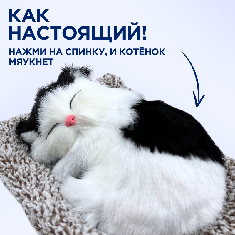 Отзывы на Мягкая игрушка спящий котик со звуком на коврике со звуком, черно-белый