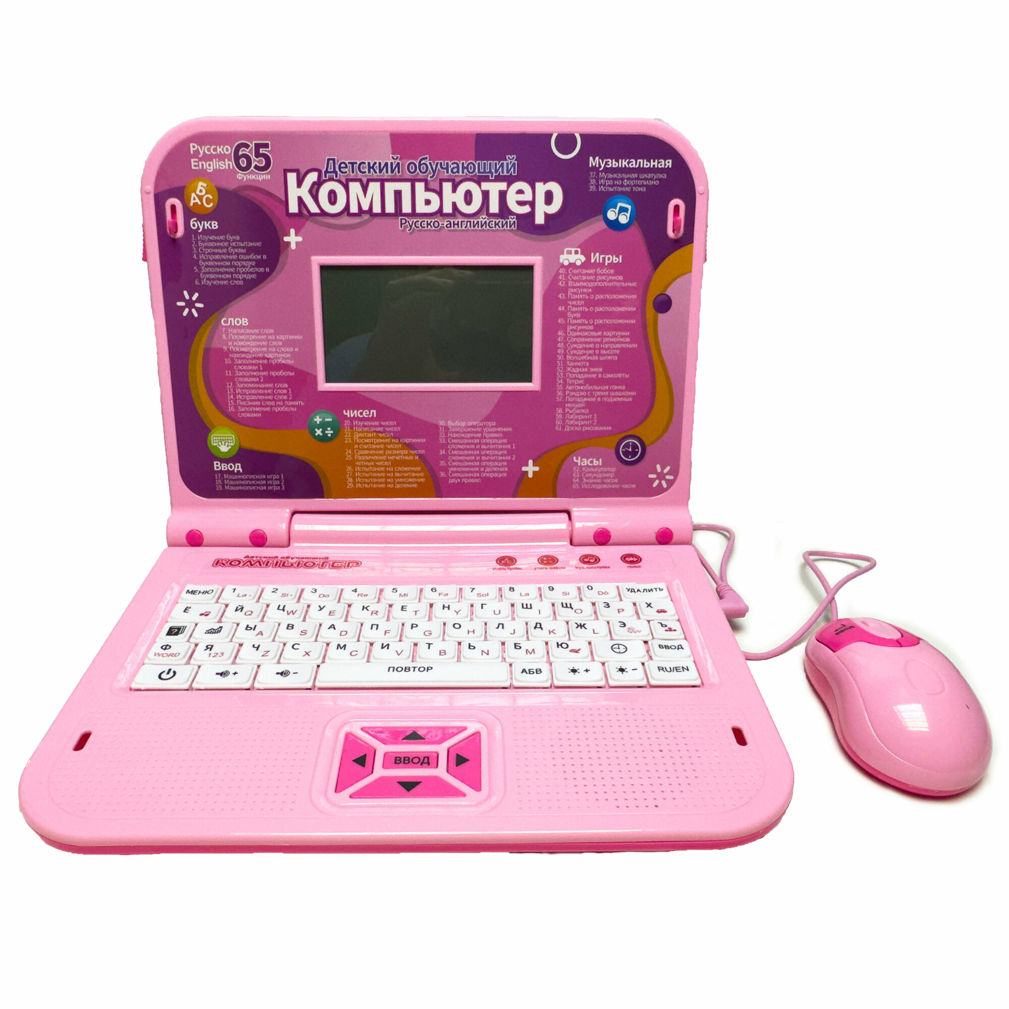 Детский обучающий компьютер ноутбук с мышкой 130 функций, музыкальный, учит алфавиту, считать, печатать, развивает речь, Розовый информация: