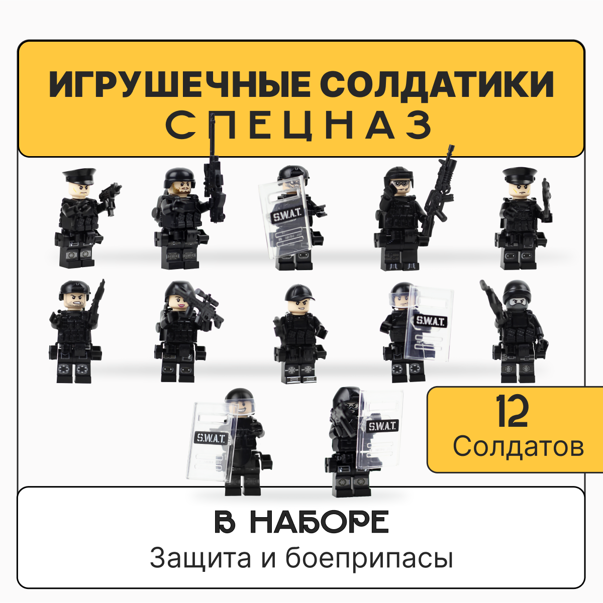 | Комплектация | солдаты спецназ-12 шт, оружие -12 шт, жилеты -12 шт |
