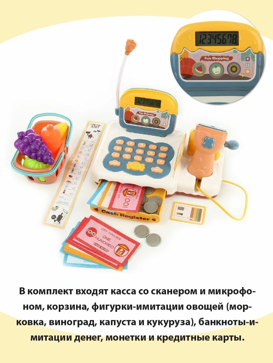 Детский игровой набор касса со сканером, Veld Co / Игрушечный кассовый аппарат со светом и звуком / Корзина с продуктами для детей информация: