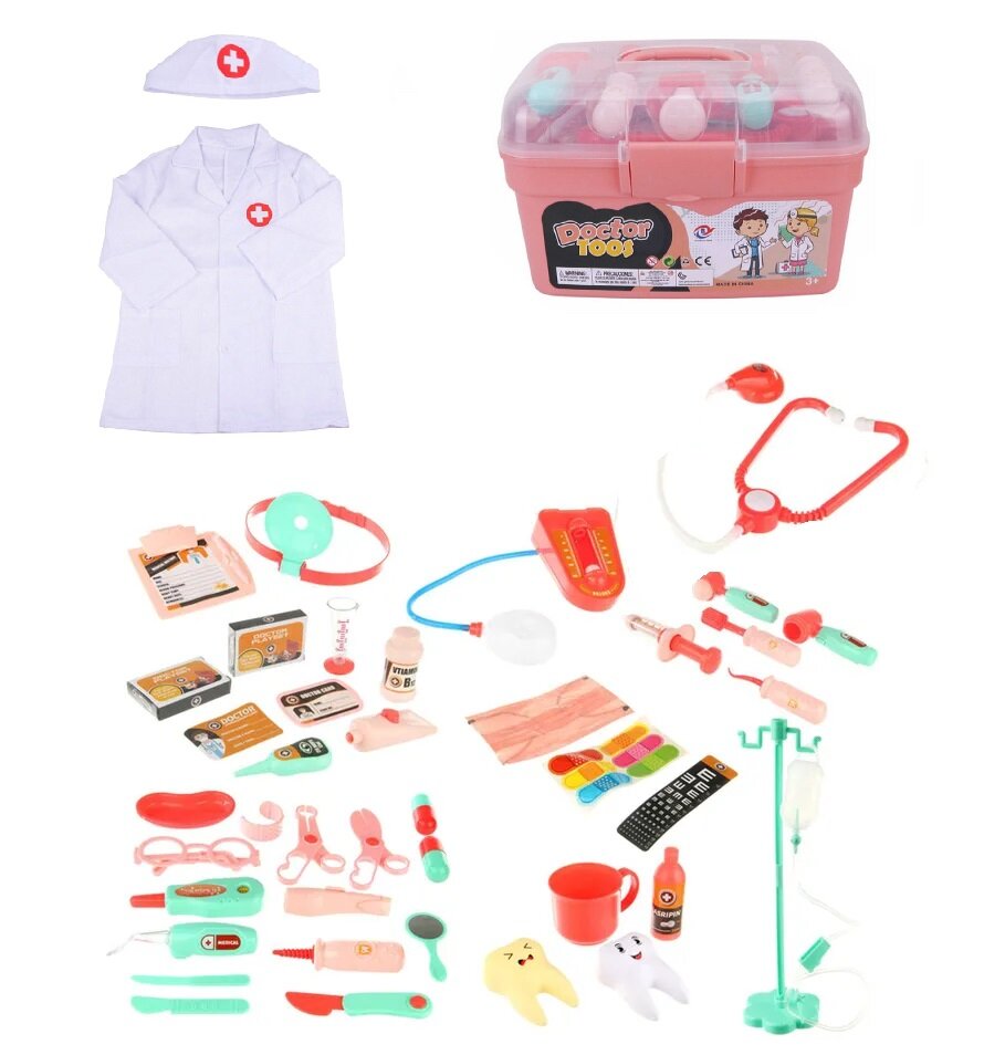 | Комплектация | -чемодан 26 х 17 х 17 см; - халат 38 х 64 см (длина рукава 37 см); -медицинская шапочка 17 х 17 х 9 см; - шприц 14.5 см; - зубная щетка 14 см; - молоточек 12 см; - фонарик 9 см; - стетоскоп 53 см; -2 макета зубиков 5 х 3 х 7 см; - очки 11,5 ( дужка 10,5), -кружка 8 х 6 х 5 см; - капельница 23 см; - лобный рефлектор окулиста 57 см; - планшет с игрушечной ручкой 11.3 х 12.3 х 2 см; - маска для лица 17 х 9 см; - лоток 10 х 5 х 1,5 см; - отоскоп; -стоматологический зонд; -стоматологическое зеркало; - щипцы; - зубная паста; - градусник; -2 таблетки; -2 капсулы; - лейкопластырь; - нож; - скальпель; - ножницы; - аппарат для давления; - таблица для проверки зрения; - мензурка; - бормашина; - витамин В12, аспирин и игрушечные капли; - бейджик, карта и карта пациента. |