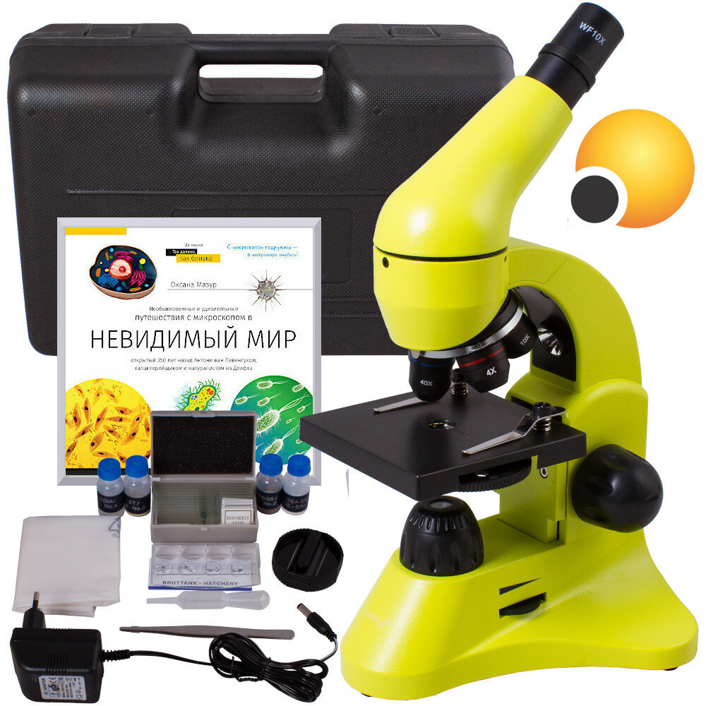 Микроскоп Levenhuk Rainbow 50L Lime\Лайм с набором для опытов, в кейсе + Подарок книга "Невидимый мир" информация: