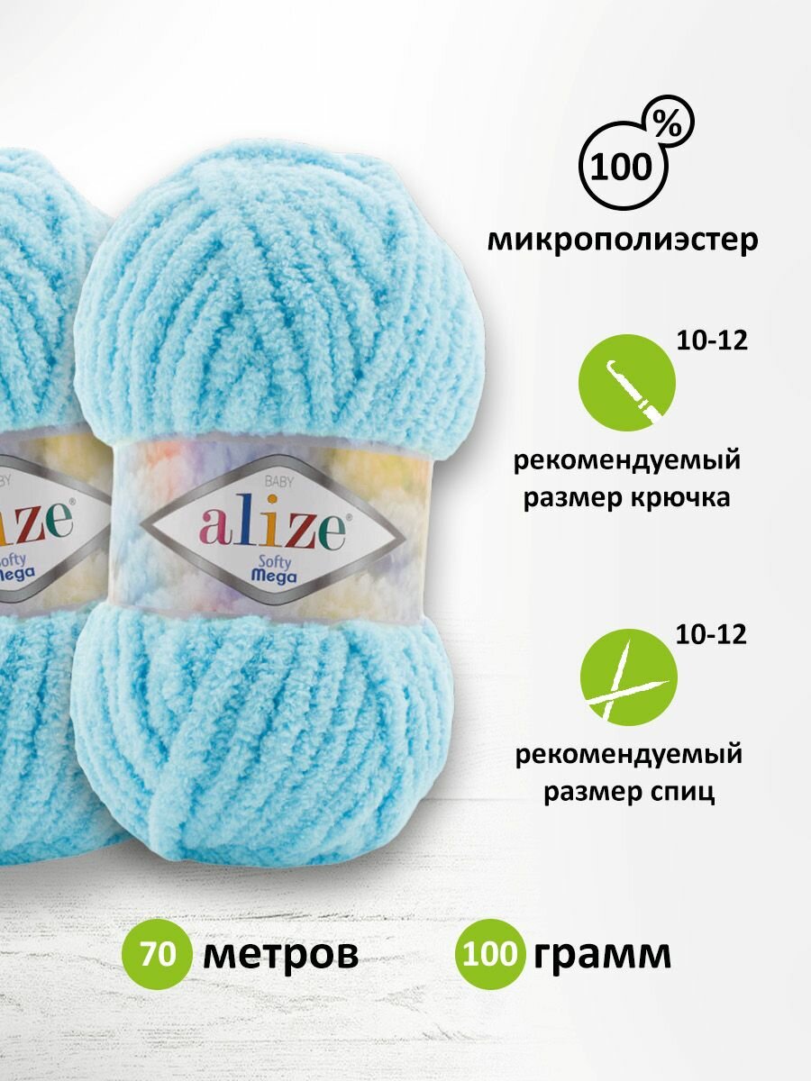 Пряжа Softy mega, Alize, голубой меланж - 374, 100% микрополиэстер, 5 мотков, 100 г, 70 м. 1 294 ₽