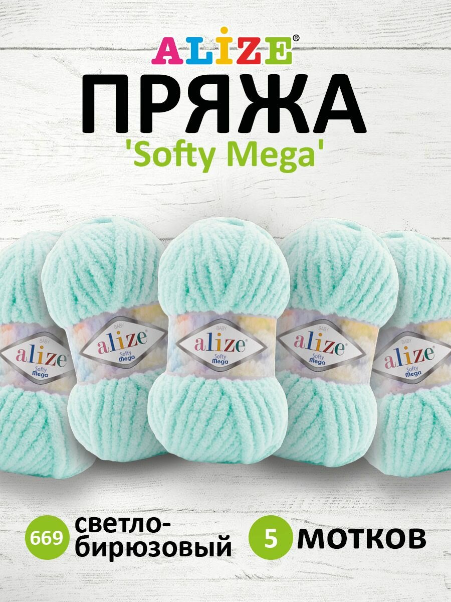 10 цен на Пряжа Softy mega, Alize, св.бирюза - 669, 100% микрополиэстер, 5 мотков, 100 г., 70 м.