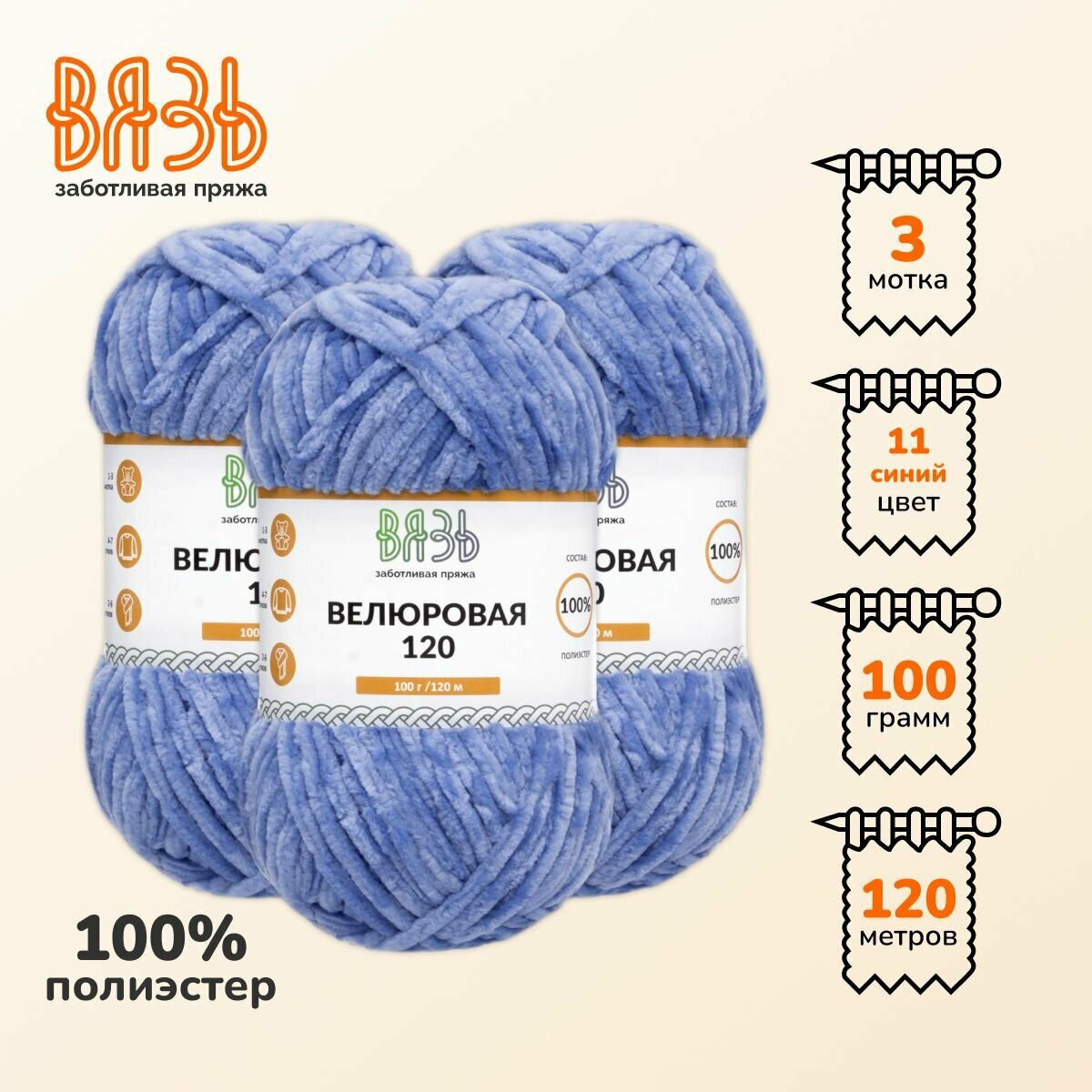 Пряжа для вязания Вязь 'Велюровая 120', 100г, 120м (100% полиэстер) (11 синий), 3 мотка информация: